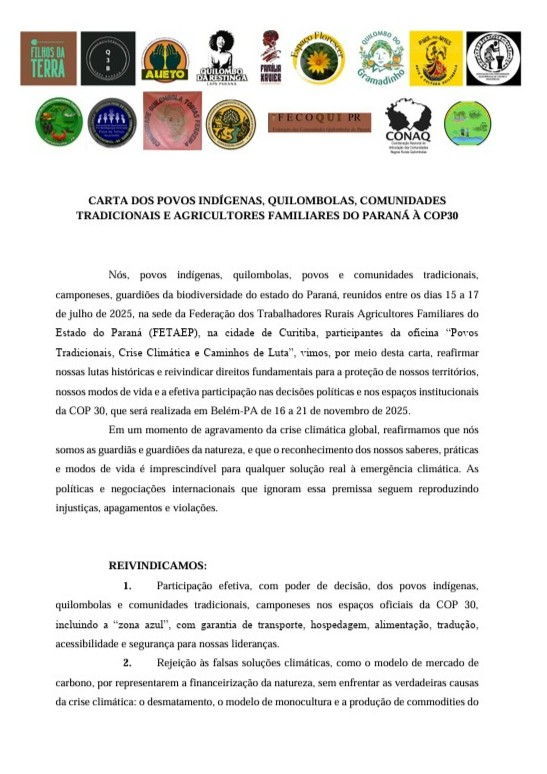 Carta dos povos indígenas, quilombolas e comunidades tradicionais e agricultores familiares do Paraná à COP30