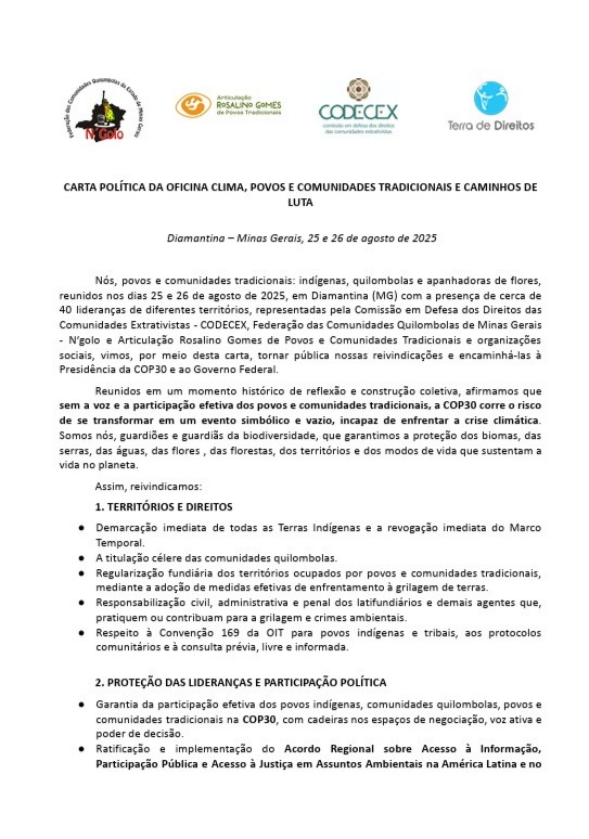 Carta política da Oficina Clima, povos e comunidades tradicionais e Caminhos de Luta (MG)