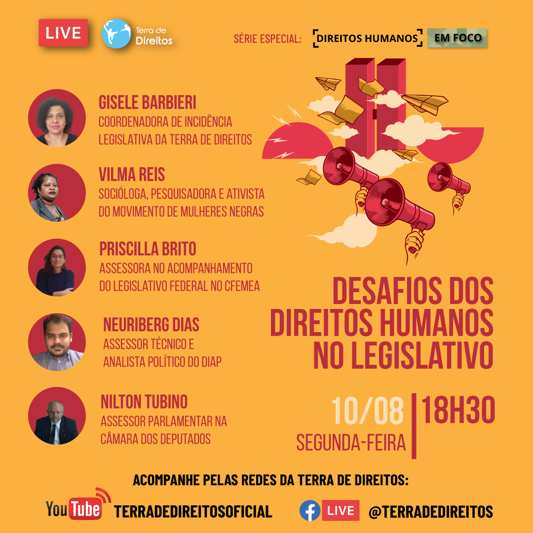 Quais os desafios da pauta dos direitos humanos no Legislativo? Durante a pandemia e com o Congresso atuando por meio de sessões remotas e sem participação popular, esses desafios aumentam? Esses serão alguns dos questionamentos orientadores de mais um debate online da série Direitos Humanos em Foco, promovido pela Terra de Direitos, nesta segunda-feira (10), às 18h30.